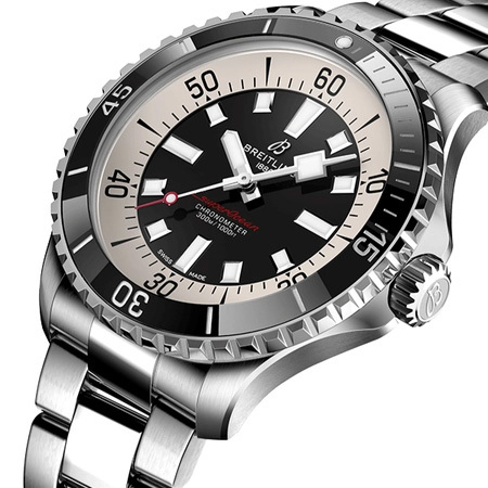 Ремешок: Модель на браслете с 3 рядами литых звеньев из нержавеющей стали, поверхности с различными видами финишной обработки, ширина 24/20 мм. Браслетная застежка, раскладывающаяся при нажатии на кнопки двойной блокировки, украшена гравировкой и эмблемой бренда Breitling.