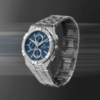 Корпус: Круглый корпус выполнен из нержавеющей стали, поверхности с матовой шлифовкой сатинированием и глянцевой полировкой. Циферблат глубокого синего цвета с шлифовкой в стиле «солнечные лучи», вспомогательные индикаторы хронографа с гильошированием в виде спиральных узоров. Аппликация часовых индексов и стрелки с алмазной огранкой имеют родиевое покрытие и полировку до зеркального блеска. Фотолюминесцентный состав Super-LumiNova на стрелках, светящийся в темноте. Сапфировое стекло с антибликовым покрытием защищает циферблат от царапин и обеспечивает отличную читаемость при любом освещении. Диаметр корпуса составляет 42 мм, толщина - 11 мм. Водозащита до 10 ATM (100 метров) делает часы подходящими для плавания.