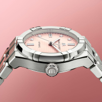Корпус: Круглый корпус выполнен из нержавеющей стали, поверхности с матовой шлифовкой сатинированием и глянцевой полировкой. Циферблат розового цвета с гильошированием в стиле «Парижские гвозди». Аппликация часовых индексов и стрелки с алмазной огранкой имеют родиевое покрытие и полировку до зеркального блеска. Инкрустация 8 бриллиантов в качестве часовых индексов. Заостренные прямоугольные стрелки в стиле Baton с люминесцентным покрытием, которое светится в темноте после непродолжительной зарядки на свету. Сапфировое стекло с антибликовым покрытием защищает циферблат от царапин и обеспечивает отличную читаемость при любом освещении. Граненая завинчивающаяся заводная головка. Диаметр корпуса составляет 35 мм, толщина - 9 мм. Водозащита до 20 ATM (200 метров) делает часы подходящими для плавания.
