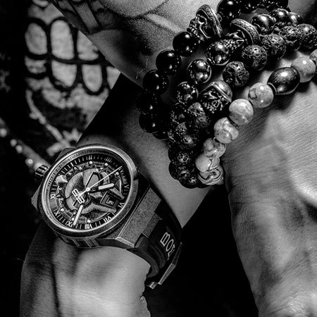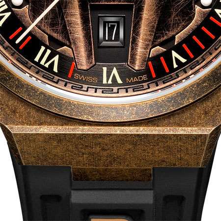 Корпус: Нержавеющая сталь марки 316L с PVD-покрытием бронза. Чёрный циферблат. Индексы и цифры с родиевым покрытием. На циферблате изображена бронзовая маска гладиатора. Фотолюминесцентное покрытие Super-Luminova® на индексах и стрелках добавляет остроты, обеспечивая при этом идеальную читаемость даже в самых темных условиях. Сапфировое стекло с антибликовым покрытием. Завинчивающаяся заводная головка на 12ч. Диаметр: 43 мм. Водозащита: 100 м.
