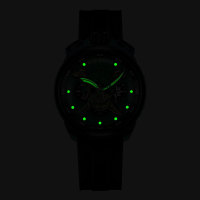 Корпус: Круглый стальной корпус марки 316L, с PVD покрытием синего цвета. Зелёный циферблат, часовые индексы и стрелки из белой латуни с люминесцентным покрытием (Super-LumiNova). На циферблате изображен уникальный рельефный череп. Сапфировое стекло с антибликовым покрытием.