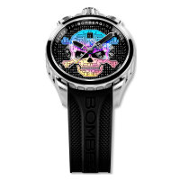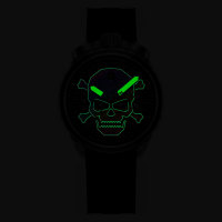 Корпус: Корпус изготовлен из стали марки 316L. Черный циферблат на котором изображен уникальный рельефный череп. Аппликация часовых индексов и стрелки с покрытием Super-Luminova®. Сапфировое стекло с устойчивостью к царапинам и антибликовым покрытием обеспечивает долговечность и удобство использования. Завинчивающаяся заводная головка. Диаметр корпуса: 45 мм. Водостойкость: 50М.
