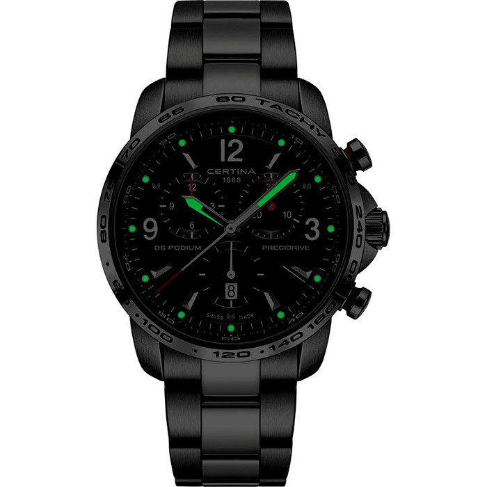 Корпус: Корпус из полированной/матовой нержавеющей стали, безель с тахиметрической шкалой. Чёрный циферблат с серебристыми стрелками (часовая, минутная) и рисками. Часовая и минутная стрелки с люминесцентным покрытием. Сапфировое стекло с антибликовым покрытием. Диаметр 44 мм. Водостойкость 200 м. Система DS.