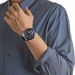Корпус: Корпус часов сделан из металла. Черный циферблат с синим безелем и метками в виде штрихов. Светящееся покрытие необрит на стрелках и метках обеспечивает длительную подсветку в темное время суток после короткого воздействия света. Стекло минеральное. Заводная головка с защитой. Задняя крышка с винтовым фиксатором. Размеры: 50,5 мм x 55 мм x 11,8 мм. Водозащита 100 м.
