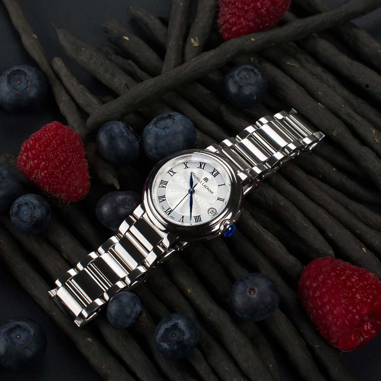Корпус: Корпус и безель из нержавеющей стали. Циферблат - серебристый гильоше, синии стрелки и чёрные римские цифры. Выпуклое сапфировое стекло с антибликовым покрытием. Водонепроницаемость 30 метров. Размер 32 мм.