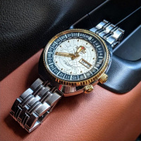 Функции: Индикация часов, минут и секунд при помощи центральных стрелок. Окошко даты и дня недели находится в положении 3 часа. 12-ти и 24-х часовой формат времени отображается на внутреннем вращающимся безеле, который управляется заводной головкой расположенной в положении 4 часа.
