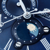 Функции: Центральные часовая, минутная и секундная стрелки. День недели и индикатор день/ночь отображаются на отдельных циферблатах. Окошко даты находится в положении 8 часов.