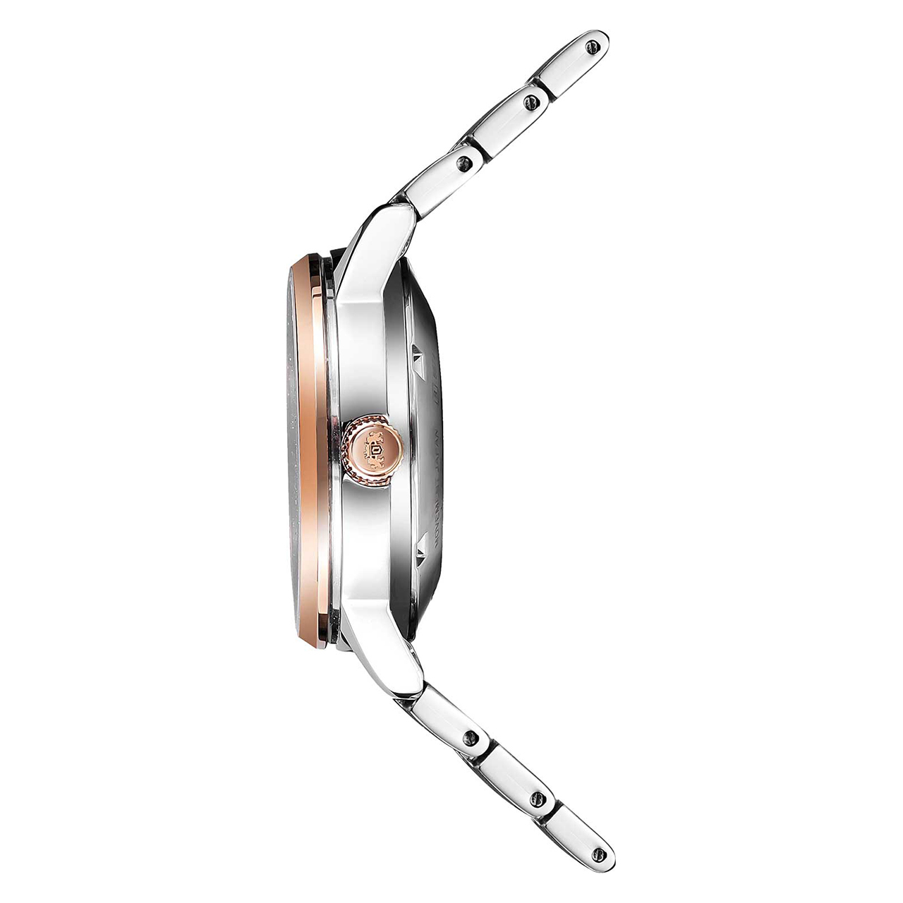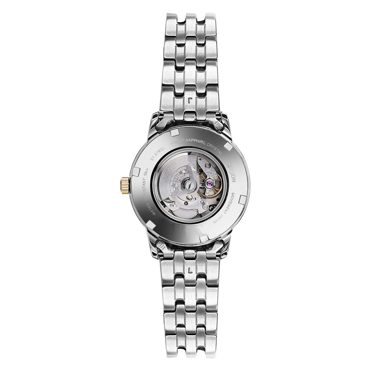 Корпус: Корпус из высококачественного стального сплава 316L с высокими антикоррозийными свойствами и частичным розовым PVD покрытием. Белый перламутровый циферблат с часовыми метками в виде точек и штрихов, украшен кристаллами. Сапфировое стекло устойчивое к царапинам. Прозрачная завинчивающаяся задняя крышка. Диаметр корпуса 32 мм. Водостойкость WR 50.