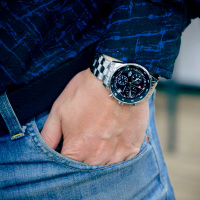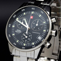 Функции: Центральные часовая и минутная стрелки, маленький секундный индикатор на «3 часах». Дата. Хронограф.