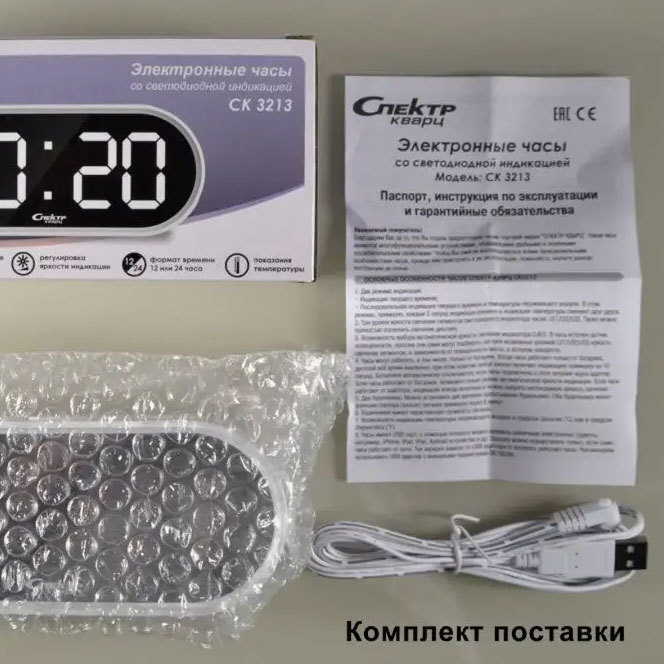 Механизм: Часы настольные с цифровой индикацией с будильником и измерением температуры. Яркость свечения часов можно менять (три уровня яркости) или полностью отключить индикацию. В режиме выключенной индикации нажатие любой кнопки кратковременно включит индикацию. Также у часов есть ночной режим работы индикации, который позволяет автоматически снизить яркость свечения в тёмное время суток. При включённом ночном режиме, в настроенный промежуток времени яркость индикации дисплея автоматически будет установлена на минимальный уровень. Часы могут работать в трёх режимах: отображение текущего времени, отображение температуры окружающего воздуха и режим попеременного отображения времени и температуры. Две центральные точки на дисплее часов не мигают. Часы могут работать, в том числе, только от батареек, т.е. без подключения к внешнему источнику питания. Когда часы работают только от батареек, дисплей всё время выключен, при этом нажатие любой кнопки или кратковременное нажатие на корпус часов сверху включит индикацию примерно на 10 секунд. У часов есть один будильник. Температура может показываться в градусах Цельсия или в градусах Фаренгейта. Питание осуществляется от порта USB. В комплекте с часами идёт USB шнур (1,5 метра) для питания часов от USB источника (5V). Для питания можно использовать, например, любой адаптер, предназначенный для зарядки мобильных телефонов, и имеющий USB выход. Блока питания от сети 220V в комплекте нет.
