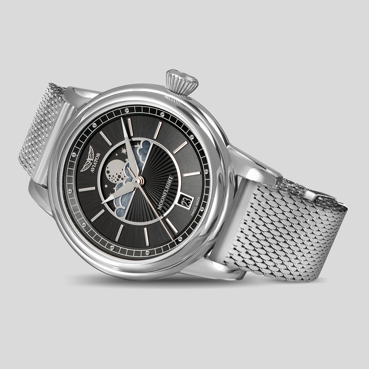 Корпус: Корпус круглой формы выполнен из нержавеющей стали марки 316L. Циферблат чёрного цвета с различными видами финишной обработки. В центральной части стилизация под гильоширование, окруженная шлифовкой в стиле «солнечные лучи». Аппликация часовых индексов и меток-точек. Облака рядом с индикатором фаз Луны с инкрустацией перламутром. Сапфировое стекло с двусторонним антибликовым покрытием имеет повышенную устойчивость к возникновению царапин. Задняя крышка с гравированным изображением авиалайнера Douglas DC-3 имеет винтовое соединение с корпусом. Диаметр: 36 мм. Водостойкость 100 метров (10 АТМ).