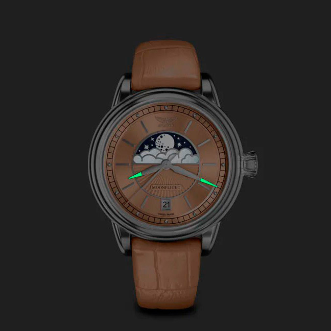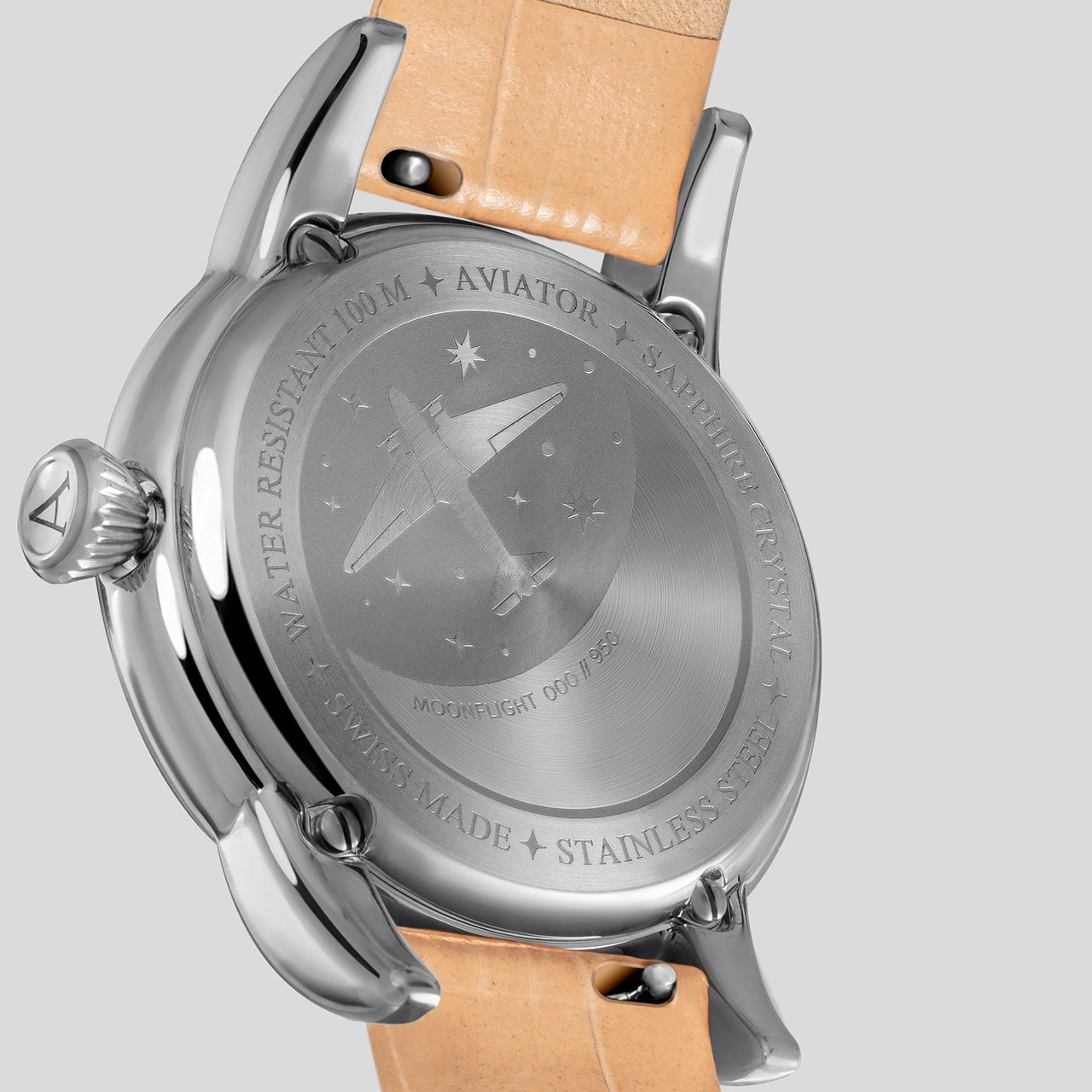 Корпус: Нержавеющая сталь марки 316L. Бежевый циферблат. Стрелки и часовые индексы серебристого цвета покрыты люминесцентным составом SuperLuminova. Облака на циферблате украшены перламутровыми вставками. Задняя крышка украшена гравировкой. Рифлёная заводная головка. Сапфировое стекло с антибликовым покрытием. Водонепроницаемость 100 метров. Диаметр 36 мм.