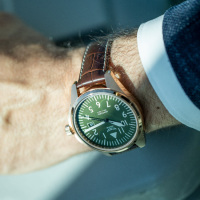Корпус: Корпус выполнен из высококачественной стали марки 316L с повышенной устойчивостью к коррозии, поверхности с матовой шлифовкой – сатинированием с PVD покрытием. Матовый циферблат с зернистой отделкой имеет окраску зелёного цвета. Контрастные часовые метки и цифры. Стрелки благодаря яркому люминесцентному покрытию SuperLuminova отлично читаются в полнейшей темноте и в условиях слабой освещенности. Сапфировое стекло с двусторонним антибликовым покрытием имеет повышенную устойчивость к возникновению царапин. Переводная коронка с двойным уплотнителем и винтовой фиксацией для дополнительной защиты от попадания воды внутрь корпуса. Задняя крышка имеет резьбовое соединение с корпусом. Диаметр корпуса составляет 42,8мм, толщина 9,95мм. Водостойкость 100 метров (10 АТМ).