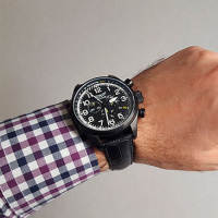 Ремешок: Черный ремешок из телячьей кожи с тиснением под аллигатора, ширина 22/20 мм, классическая застежка – пряжка из нержавеющей стали с чернением (PVD).