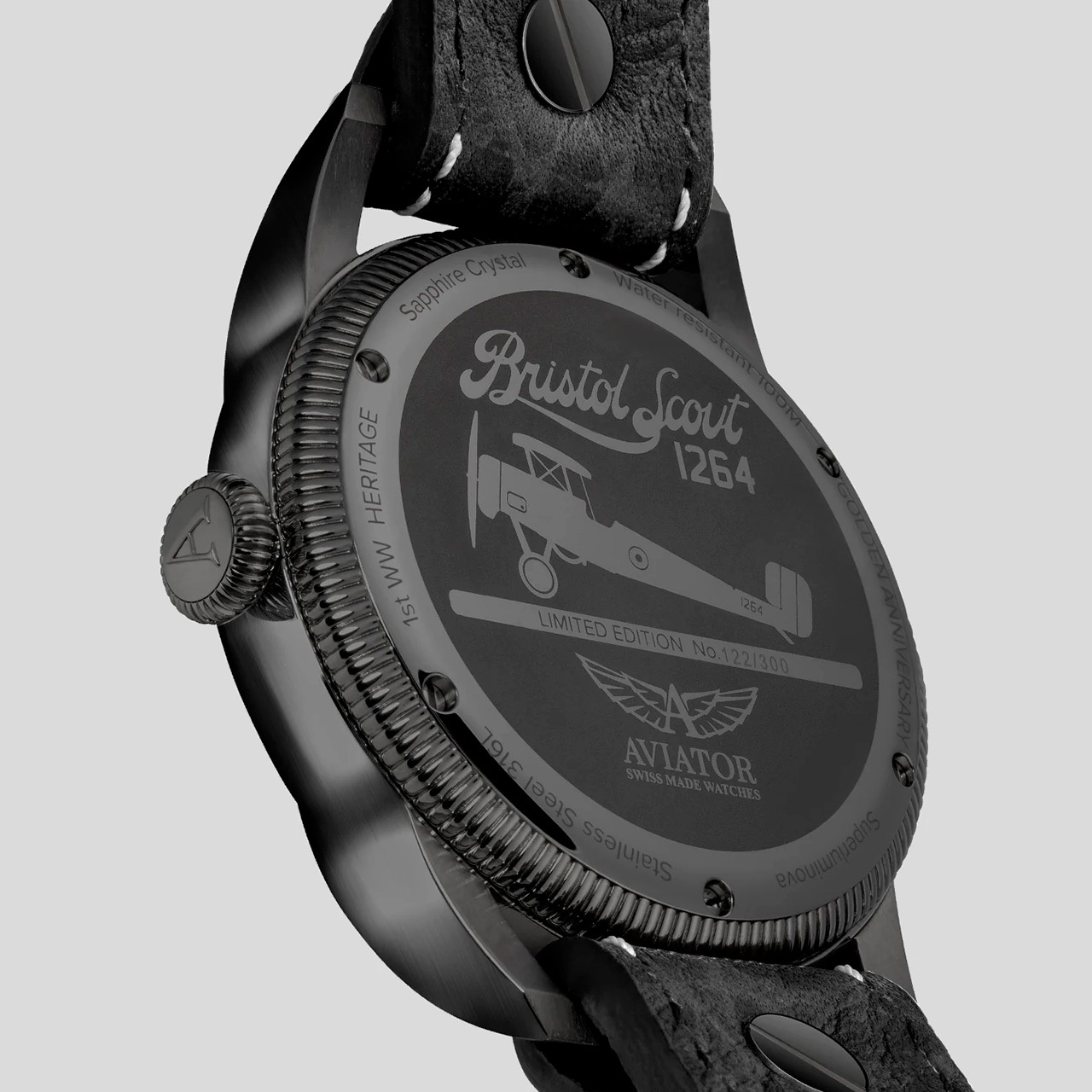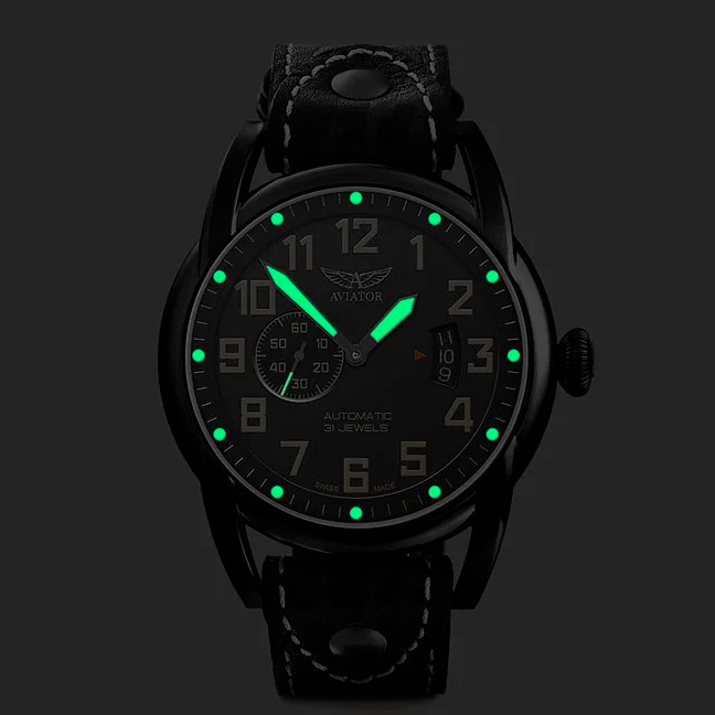 Корпус: Большой корпус в стиле карманных часов с необычными дужками выполнен из матовой нержавеющей стали марки 316L, с чёрным PVD покрытием. Циферблат, похожий на приборную панель самолета, зелёного цвета c цифрами, стрелками и индексами, покрытыми светонакопительным составом Super-Luminova. Сапфировое стекло с двусторонним антибликовым покрытием имеет повышенную устойчивость к возникновению царапин. Задняя крышка украшена гравировкой с изображением самолета и имеет винтовое соединение с корпусом. Диаметр 46 мм, толщина 12,8 мм. Водостойкость 100 метров (10 АТМ).