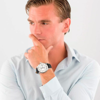 Ремешок: Черный ремешок из телячьей кожи с тиснением под аллигатора. Браслетная застежка из нержавеющей стали, раскладывающаяся при нажатии кнопок двойной блокировки.