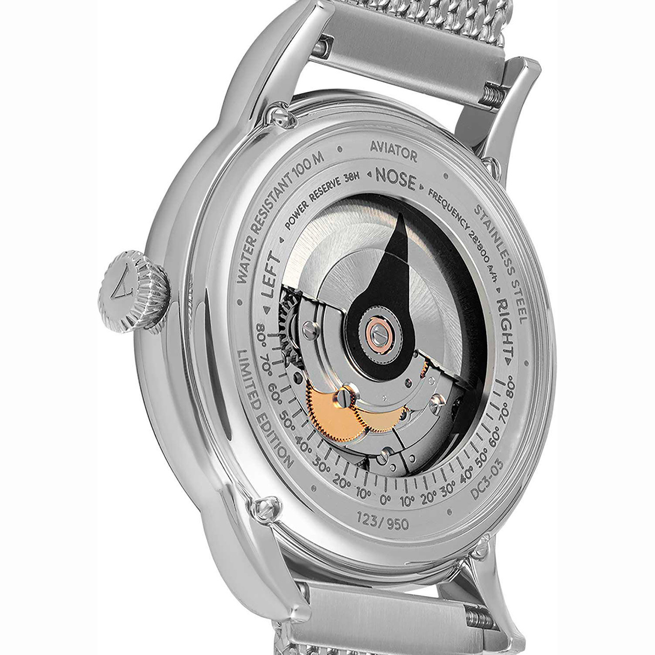 Корпус: Нержавеющая сталь марки 316L. Объемный циферблат с центральной частью серебристого цвета. Стрелки и часовые индексы покрыты люминесцентным составом SuperLuminova. Сапфировое стекло с антибликовым покрытием. Переводная коронка с двойным уплотнителем для дополнительной защиты. Задняя крышка с прозрачным окном из сапфирового стекла имеет винтовое соединение с корпусом. В оформлении задней крышки использована стилизация под один из инструментов управления из кабины самолета Douglas DC-3. Гравировка с градусами на крышке корпуса и стрелка на роторе автоподзавода имитируют функцию угла перекладки руля, которая контролирует положение передней и задней частей самолета. Водонепроницаемость: 100 метров. Диаметр: 45 мм.