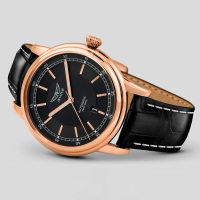 Ремешок: Чёрный ремешок из телячьей кожи с тиснением под аллигатора, ширина 22/18 мм. Браслетная застежка из нержавеющей стали, раскладывающаяся при нажатии кнопок двойной блокировки.