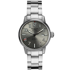 2. Модель V.3.21.0.137.5: корпус с серым оттенком; серебристый циферблат; белые цифры, индексы и стрелки часов и минут с чёрной окантовкой, чёрная секундная стрелка с красным наконечником; стальной браслет. | |