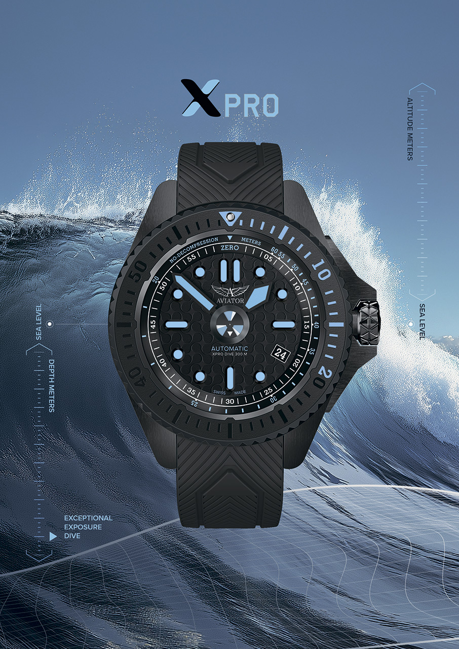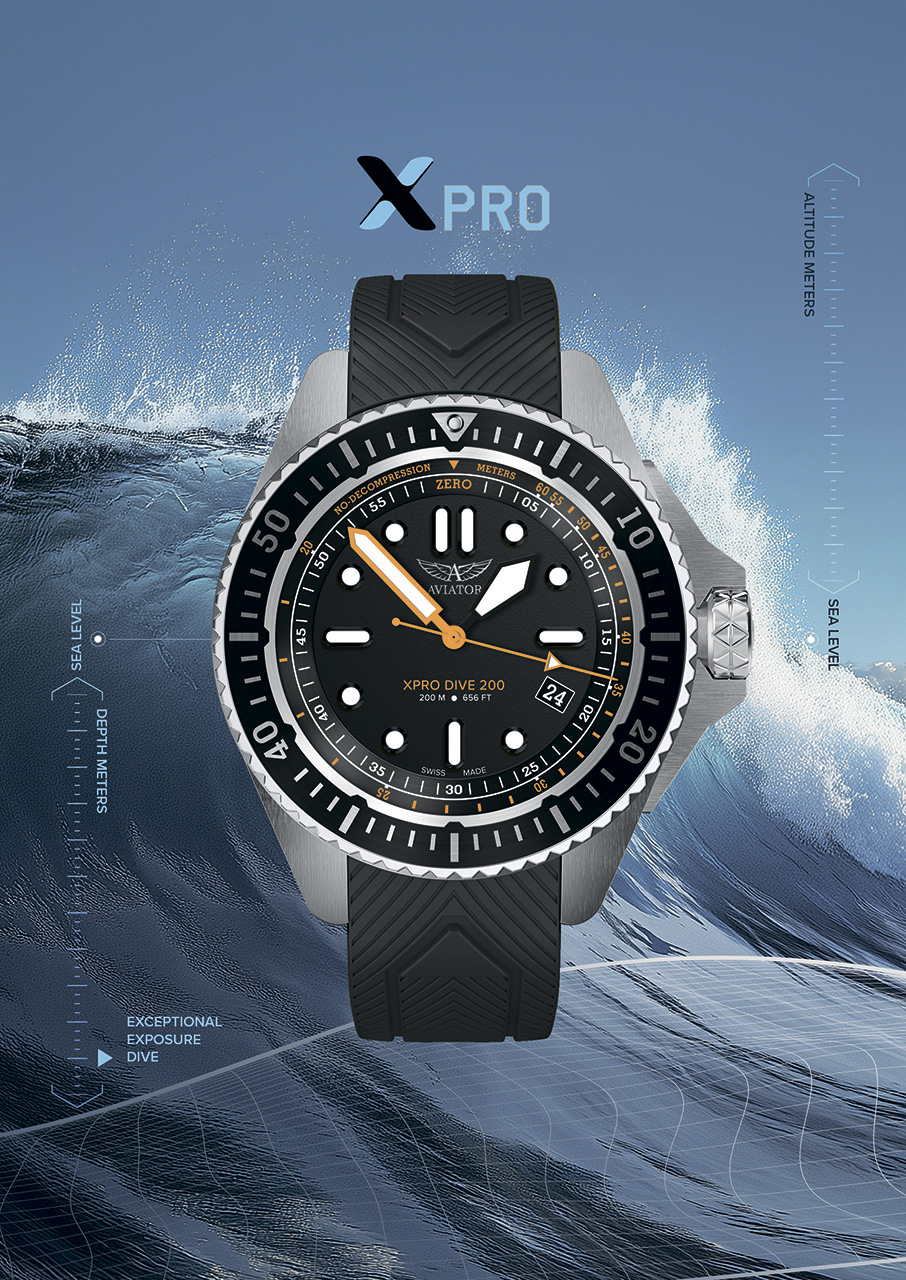 Коллекция Aviator XPRO DIVE соединяет два мира — авиацию и дайвинг. Эти часы разработаны для профессионалов, которым важны точность, надёжность и читаемость в любых условиях - от высоты полёта до глубины океана.
