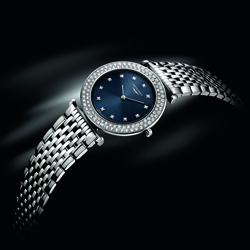 Эти часы объединяют в себе классическую элегантность ультратонких моделей и сияние 100 бриллиантов. Особого внимания заслуживает ультратонкий корпус, толщина которого составляет всего 4.60 мм. Такой параметр достигнут благодаря уникальному дизайну корпуса, запатентованному Longines: задняя крышка является в то же время креплением браслета. Новые модели украшены 100 бриллиантами Top Wesselton VVS по безелю и 12 бриллиантовыми индексами. Циферблаты нескольких оттенков, но особенно эффектно бриллианты сверкают на синем циферблате.