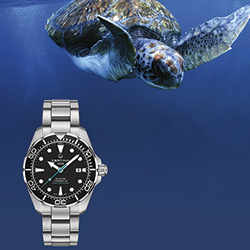Новые дайверские часы от Certina отлично себя чувствуют как на суше, так и под водой: они отвечают всем требованиям стандарта ISO 6425 в качестве модели для дайвинга. Под конструкцией корпуса из нержавеющей стали диаметром 43 мм скрыт автоматический калибр Powermatic 80 с запасом хода в 80 часов. Однонаправленно вращающийся безель, покрытие Super-LumiNova®, завинчивающаяся заводная головка и крышка завершают сверхпрочную концепцию DS Concept и обеспечивают водонепроницаемость на глубине до 300 метров. Матовый браслет часов, выполненный из нержавеющей стали, оснащен раскладывающейся застежкой с двумя кнопками и удлинителем для дайвинга. Синяя секундная стрелка и надпись «Diver's Watch 300 м» аналогичного оттенка напоминают о фирменном цвете организации Sea Turtle Conservancy – аквамарине. На задней части корпуса размещен ее фирменный логотип в виде черепахи.