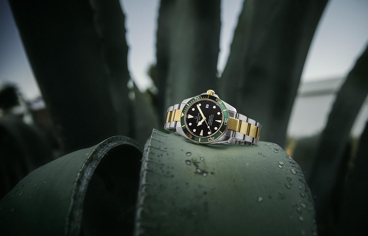 • Однонаправленно вращающийся алюминиевый безель зеленого цвета с золотистыми отметками с PV-покрытием и покрытием Super-LumiNova® .