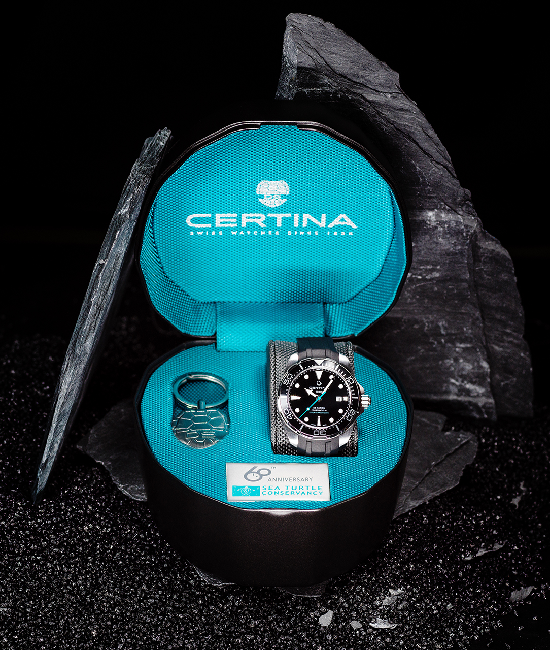 С 1959 года, уже 60 лет организация Sea Turtle Conservancy, партнером которой является марка Certina, занимается защитой морских черепах. В том же году часовой производитель представил свою концепцию DS с символом в виде черепахи. Двойной юбилей швейцарская мануфактура отмечает выпуском часов для дайвинга – DS Action Diver Sea Turtle Conservancy 60th Anniversary. Новая модель отвечают требованиям стандарта ISO 6425. Новинка 2019 года заимствует цвета и логотип организации по защите животных и преподносит их в необычном ключе.