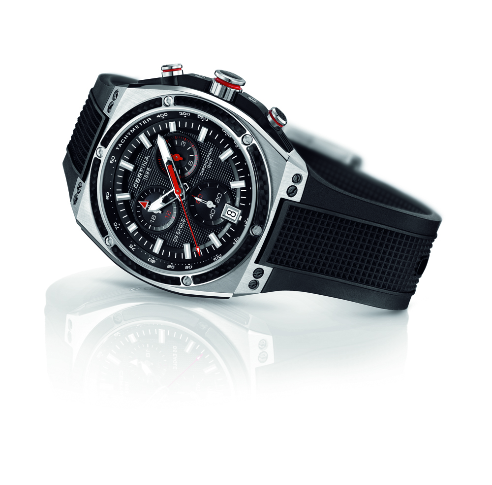 Корпус новых часов, диаметром 46 мм, выполнен из сатинированной нержавеющей стали марки «316L» и имеет контрастную матовую полированную поверхность. Он оснащён укреплённым на шести болтах чёрным массивным безелем с вставками из углеродного волокна, а также завинчивающейся заводной головки с монограммой «DS» и двумя кнопками хронографа. Все три последние детали украшены красными декоративными поясками. Тыльная сторона корпуса закрыта завинчивающейся задней крышкой с изображением символа марки – черепахи. Корпус снабжён боковыми, укреплёнными на болтах скобами, которые не только обрамляют корпус, но и являются предохранительным, защитным элементом для кнопок и заводной головки. Хронограф «Certina DS Eagle GMT» оборудован швейцарским кварцевым механизмом «ETA G10.961» с функцией 24-часового указателя времени второго часового пояса.
