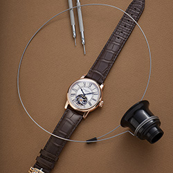 Эти более тонкие и изящные часовые метки изысканно выделяются на белом лакированном циферблате и сопровождаются минутной шкалой «железная дорога», что приближает новую модель к стандартам, существовавшим чуть более века назад. Чтобы не нарушать дух, присущий коллекции с момента ее создания, Мануфактура использовала черные стрелки, разработанные в 2004 году, с очень тонкой минутной стрелкой в форме листа и сердцеобразной часовой стрелкой.