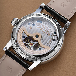 Знаменитая лукообразная заводная головка, также характерная для классического дизайна, была сохранена, как и мануфактурный механизм, который она приводит в движение. Часы Classics Heart Beat Manufacture оснащены калибром FC-930-3 с частотой 28 800 колебаний в час и 38-часовым запасом хода, который был разработан и собран в женевской мастерской Frederique Constant. Декорированный мелким круговым зернением и узором Côtes de Genève, он виден через прозрачную заднюю крышку часов.