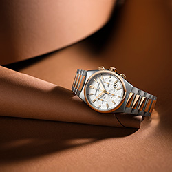 Вторая модель единственная из трех представлена в двухцветном исполнении с чередованием стали и розового золота с покрытием на центральном звене браслета, безеле, кнопках, стрелках и индексах. Деликатные штрихи розового золота на серебристом циферблате придают этой версии роскошный и яркий облик, демонстрируя способность коллекции Highlife адаптироваться ко всем современным стилям жизни. Для тех, кто желает создать более спортивный образ, к этой версии прилагается коричневый каучуковый ремешок.