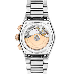 Задняя крышка корпуса сделана из сапфирового стекла, сквозь которое виден автоматический механизм FC-391 с модулем хронографа, и, в частности, колонное колесо, расположенное в положении «3 часа», которое просвещенные любители легко заметят. Разработанный в сотрудничестве с мануфактурой La Joux-Perret, этот калибр может похвастаться не только примечательной современной конструкцией, но и высокой степенью качества и отделки. Кроме того, для каждой из этих новых моделей Frederique Constant разработал ротор из розового золота с покрытием, украшенный узором Côtes de Genève, который является излюбленным мотивом бренда, чья мануфактура также находится в Женеве.