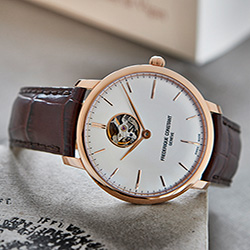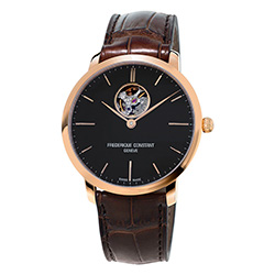 3. Frederique Constant Slimline Auto Heart Beat, FC-312G4S4 Корпус из нержавеющей полированной стали с гальваническим покрытием розовым золотом. Тёмно-серый циферблат с открытым балансом «Heart Beat», тонкими полированными стрелками и условными индексами с отделкой гальваническим покрытием из розового золота. Коричневый кожаный ремешок. |