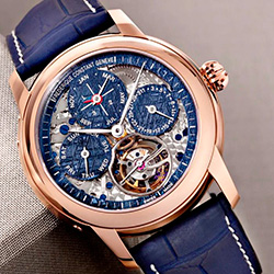 Часы The Meteorite Tourbillon Perpetual Calendar Manufacture Only Watch Model – это уникальная модель, представленная в корпусе диаметром 42 мм из трех частей 18-каратного розового золота с прозрачной задней крышкой, позволяющей любоваться изящными украшениями Perlage & Côtes de Genève. Часы имеют потрясающий, скелетонизированный голубой оттенок метеоритного циферблата. Этот очень редкий материал упал на Землю 80 000 лет назад и был найден в Намибии еще в 1839 году.