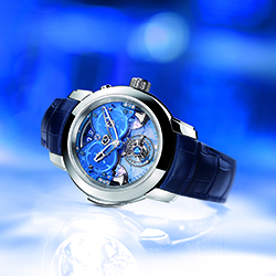 Уникальная новинка «Imperial Blue» представляет собой восхитительную комбинацию часового и ювелирного мастерства. Она продолжает славные традиции мелодичных репетиров, несёт в себе сразу несколько превосходных усложнений: минутный репетир «Grande Sonnerie Carillon Westminster»* с Вестминстерским четвертьчасовым перезвоном и автоматическим боем по истечении каждого часа, парящий турбийон,** а также календарь «большая дата».