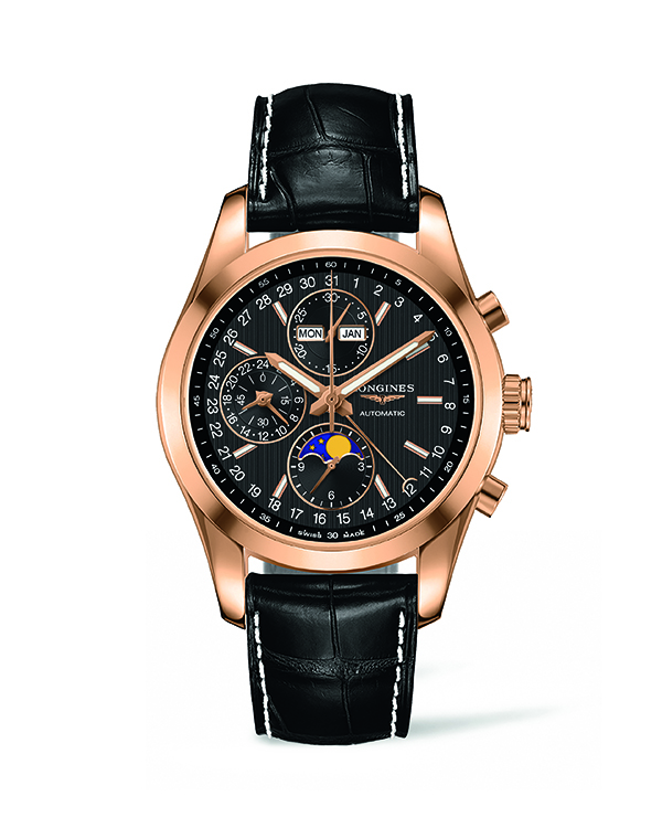 5. Longines Conquest Classic Moonphase L2.798.8.52.3: золотой (розовое золото 18 карат) корпус, чёрный циферблат, чёрный кожаный ремешок. | |