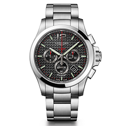 Часы в корпусе из нержавеющей стали Ø42 мм оснащены хронографом, 30-минутный счетчик расположен на отметке «3 часа», 12 часовой на отметке «9 часов» и 60-секундный счетчик расположен в центре. Карбоновый циферблат часов отображает часы, минуты и секунды. Финальный штрих к портрету этой модели – стальной браслет с надежной складной застежкой.