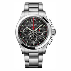 Модели из стали и с черным PVD-покрытием представлены в двух вариантах корпуса: диаметром 42 и 44 мм. Часы оснащены часовой, минутной и секундной стрелками. На циферблате размещены 30-минутный счетчик — на отметке «3 часа», 12-часовой счетчик — на отметке «9 часов» и 60-секундный счетчик — в центре. Корректировка показаний осуществляется с помощью электронной заводной головки. Индикатор срока службы батарейки предупреждает о необходимости заменить элемент питания. Новая модель хронографа доступна в нескольких вариантах цветового оформления: с циферблатами синего, карбонового, серебристого и черного цветов. Часы крепятся на стальной браслет или каучуковый ремешок черного/синего цвета.