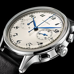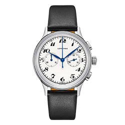 Повторяя дизайн исторической модели, новый хронограф имеет выпуклый серебристо-белый циферблат с двумя искусно выполненными счетчиками: один на 30 минут, второй – для малой секундной стрелки. Гармоничные арабские цифры в характерном для того периода курсивном шрифте «dolphin» придают этим часам неповторимый облик. На циферблате у отметки «12 часов» символами в античном стиле изящно нанесена надпись «LONGINES». Подчеркивают красоту этих элегантных часов синие стальные стрелки листообразной формы под сапфировым стеклом с антибликовым покрытием.