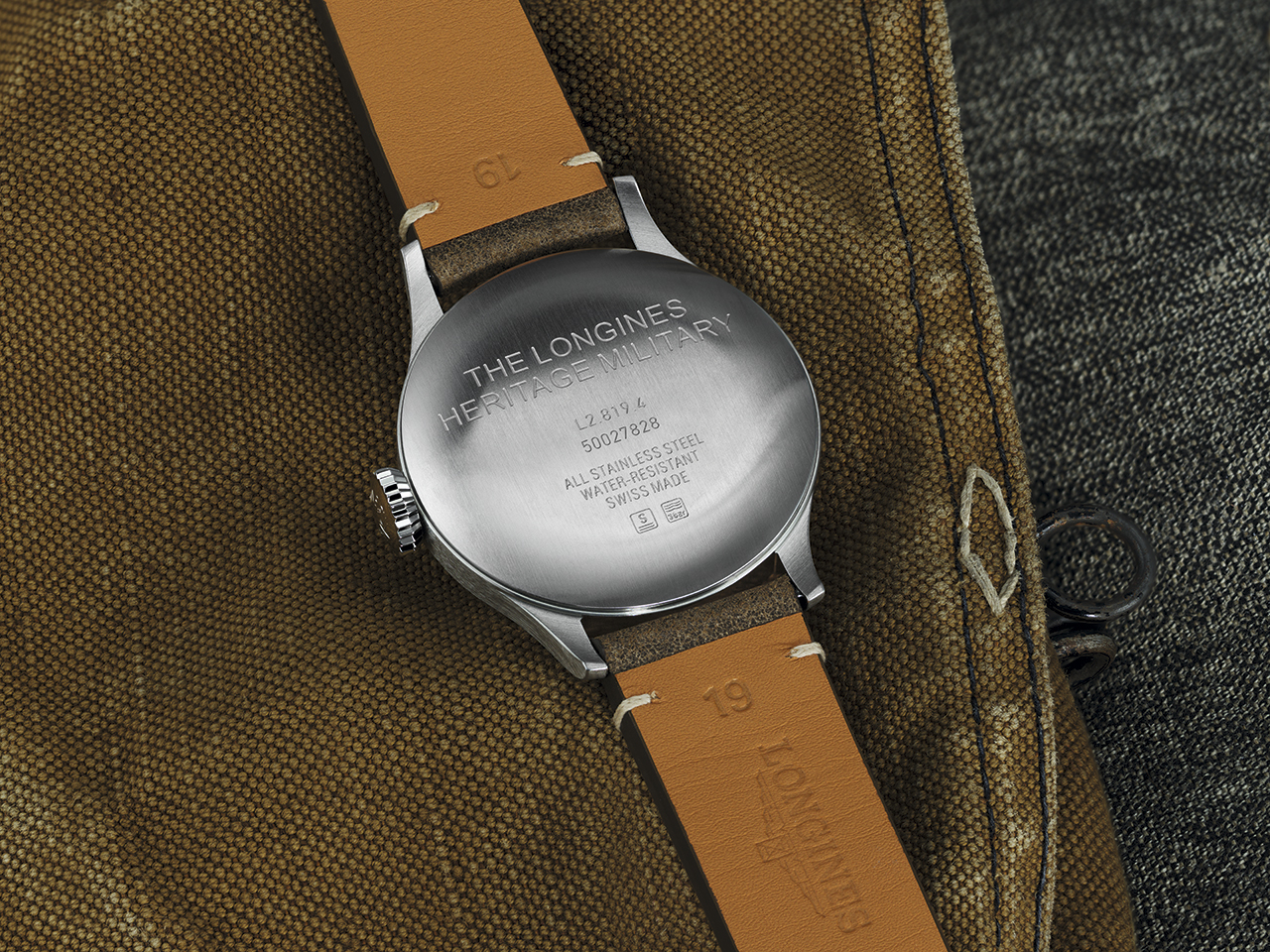 Часы Longines Heritage Military оснащены серебристым матовым циферблатом с тонкой паутинкой из мелких капель черного цвета. Процесс напыления краски, имитирующего окисление металла как у оригинала, использован Longines впервые и выполняется полностью вручную. Несмотря на наличие автоматического калибра, эти часы являются единственными в текущих коллекциях Longines без надписи Automatic на циферблате. Это позволяет им сохранить дух 40-х годов.