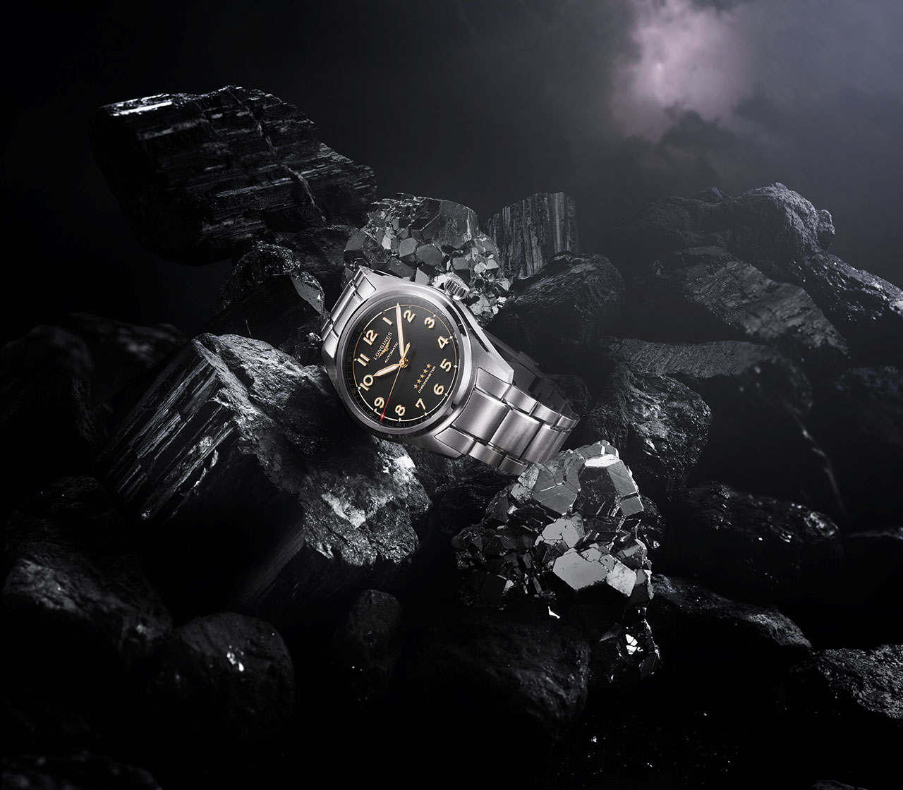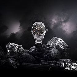 В часах Longines Spirit темные оттенки перекликаются с легким блеском, напоминая о происхождении материала — горная порода. Стрелки, цифры, звезды и песочные часы излучают приглушенное сияние мягкого золота (1N), создавая идеальный баланс между цветами и материалами, а отсутствие окошка даты только подчеркивает авиационную симметрию часов.