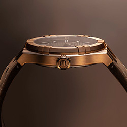 Там, где предыдущая 42-мм бронзовая модель имела глубокий синий циферблат с арабскими цифрами в 12, 6 и 9 часов, AIKON Automatic Bronze входит в новое пространство изысканности с градиентным цветом дымчатого шоколада. Текстура Clous de Paris добавляет объем и сложность, а логотип Maurice Lacroix из золота на 12 часах служит маяком блеска. Это игра света и тени, где граненые стрелки часов, минут и секунд в золоте скользят по индексам, которые тоже в золоте. Применение белых вставок Super-LumiNova® на индексах, а также часовых и минутных стрелках обеспечивает оптимальную читаемость даже в темном освещении.