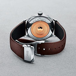 К оформлению задней крышки в компании Oris также подошли творчески – она выполнена в виде кимвала, музыкальной тарелки. Внутри часов установлен механизм Oris 733 (на базе SW 200-1), его балансовая частота 28800 пк\час, запас хода 38 часов.