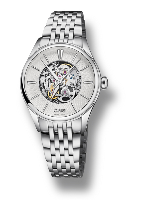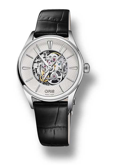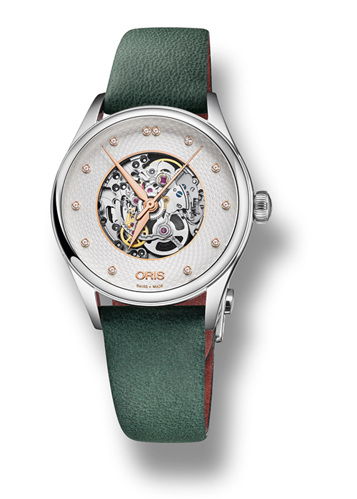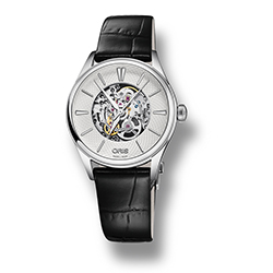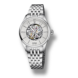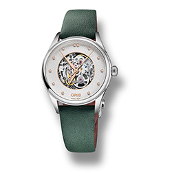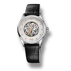 Скелетонированный механизм часов дополнен изящными стрелками классической формы. Серебристое внешнее кольцо циферблата украшено рельефным узором «гильоше» и полированными маркерами часов или бриллиантовыми маркерами. Изготовление часов со скелетонированным механизмом как ничто другое позволяет часовщику в полной мере продемонстрировать свой талант. Процесс скелетонизации предполагает удаление некоторой части циферблата, чтобы показать всю красоту деталей и устройства механизма. Подобная работа требует дополнительной кропотливой отделки деталей. А после ее завершения взору открывается впечатляющая, завораживающая картина с колесами часового механизма, вращающимися словно в балете. Часовщики Oris применили эту технику в новых женских часах Artelier Skeleton диаметром 33 мм. Тем самым они очередной раз подтвердили высочайший уровень мастерства в своем деле.
