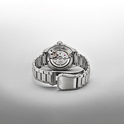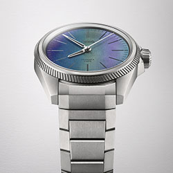 - Циферблат: Особенность этой модели — титановый циферблат, созданный при помощи лазерной техники. В зависимости от угла падения света, его цвет меняется от синего до зелёного и фиолетового, не используя пигменты, а только манипулируя поверхностью металла для преломления света.