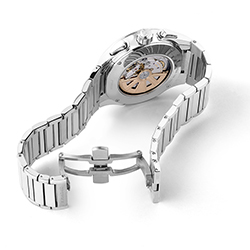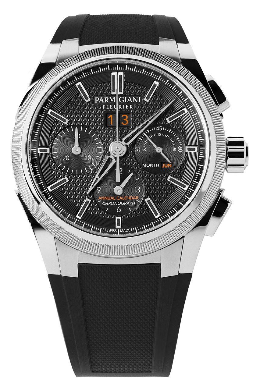 Модель Tondagraph GT работает на автоматическом калибре PF043 и обладает двумя самыми востребованными усложнениями: годовым календарем и хронографом. Этим необычным сочетанием функций Parmigiani Fleurier заполнила пробел в часовом мире, представив их в редком по уровню исполнения качестве и к тому же по исключительной цене. Циферблат изобилует указателями, но при этом легко читается. В наличии дельтовидные часовая и минутная стрелки с черным люминесцентным покрытием, малый секундный счетчик, два накопителя хронографа и большое окно указателя даты на «12 часах». Для привлечения внимания к функции годового календаря дата и месяц показываются ярким оранжевым цветом. Эти впечатляющие часы водонепроницаемы до 100 метров, имеют завинчивающуюся заводную головку, а их механизм с 45-часовым запасом хода, открытый для обзора со стороны задней крышки, украшен узором «Женевские Полосы». Тираж Tondagraph GT ограничен 200 экземплярами.