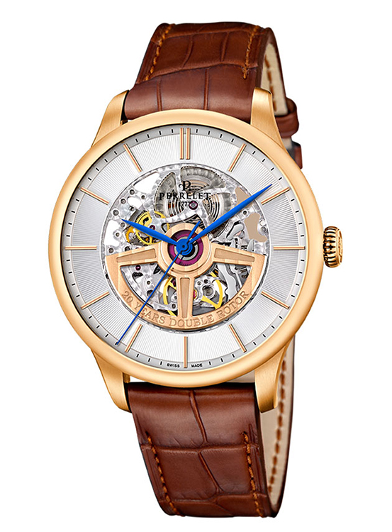 В 1999 марка «Perrelet» выпустила первые скелетонированные часы с двойным ротором –«Skeleton Watch Double».