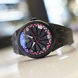 Динамичную цветовую гамму темному циферблату придает красно-белый узор в виде шахматной доски, нанесенный на минутный фланец и часовое кольцо. Смешанные индексы нанесены на циферблат и залиты Super-LumiNova. В соответствии с красной, белой и черной палитрой, вдохновленной гоночными трассами, часовая и минутная стрелки излучают белое свечение в темноте, в то время как центральная секундная стрелка с ажурным противовесом выделена ярко-красным цветом.