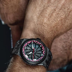 Переводя скорость гоночной трассы в формат наручных часов, циферблат Turbine Carbon Racing оснащен фирменной 12-лопастной турбиной, которая реагирует на малейшее движение запястья, вращаясь вокруг циферблата, открывая матово-черный дополнительный циферблат. Изготовленные из черного анодированного алюминия с пятью противовесами, которые позволяют ему замедляться и возвращаться в исходное положение, лезвия декорированы текстурой из углеродного волокна в тон материалу корпуса.